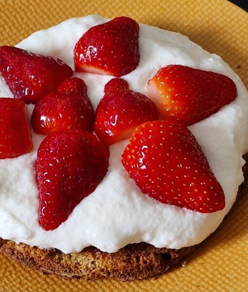 Nota : quand je prépare un gâteau maison, je ne mange pas de glucides lors de mon repas pour respecter les 7 familles, tel que je le décris dans mes livres, et pour respecter l’équilibre protéines, lipides et glucides. Ici, mon féculent est apporté par les farines. Les glucides sont variés : banane, fraise, farines, etc…